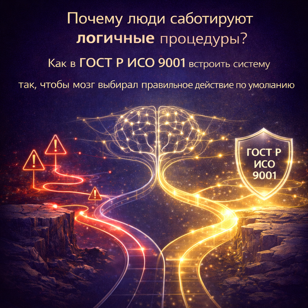 Причина обычно не в дисциплине. Причина в том, как люди принимают решения под нагрузкой: ограниченное внимание, привычки, дефицит времени, стремление сократить количество действий. Поэтому задача внедрения ГОСТ Р ИСО 9001 заключается не только в разработке процедур, но и в настройке системы так, чтобы правильное действие было самым простым и понятным вариантом.